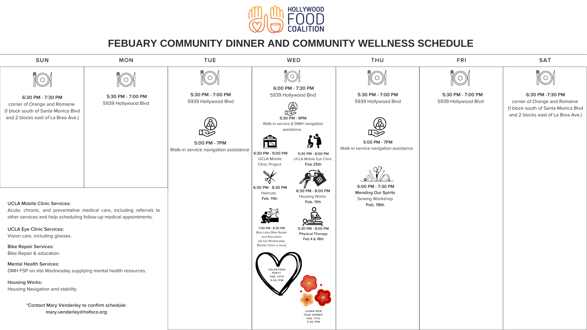 this month’s community dinner and wellness schedule